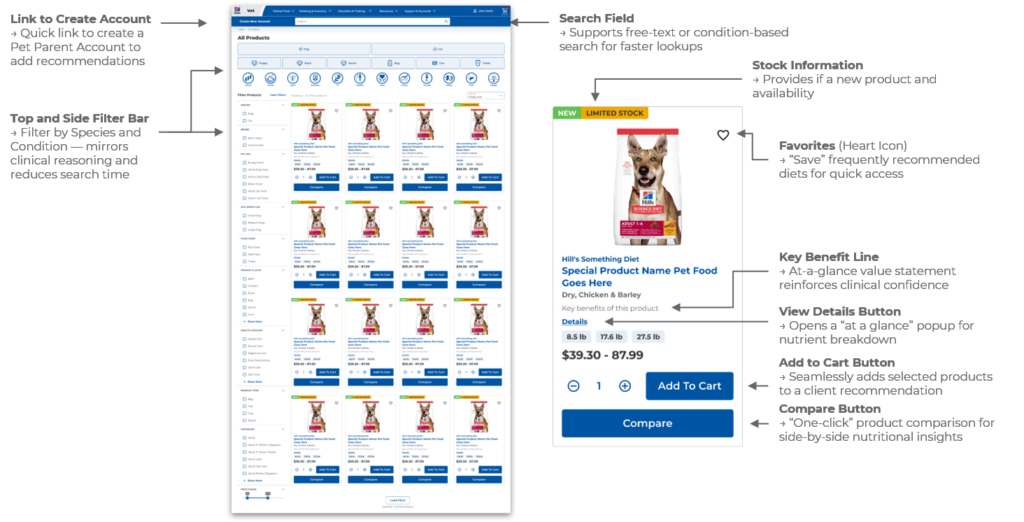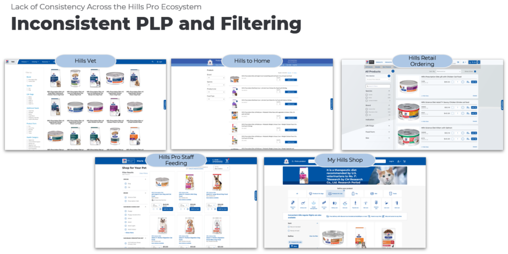 Hill’s Pet Nutrition was looking to better connect its growing ecosystem of professional tools and platforms—but not by adding more features. Instead, the goal was to better understand how veterinarians and clinic staff were actually navigating product recommendations, education, and ordering within their daily workflows. While each platform served a purpose, the overall experience had evolved in a fragmented way, creating inefficiencies and missed opportunities. We approached this by stepping into the clinical workflow—reviewing the end-to-end experience, speaking with veterinary professionals, and evaluating how decisions were made in practice—to identify where the experience could be unified, simplified, and better aligned with how care teams recommend and deliver nutrition solutions.
