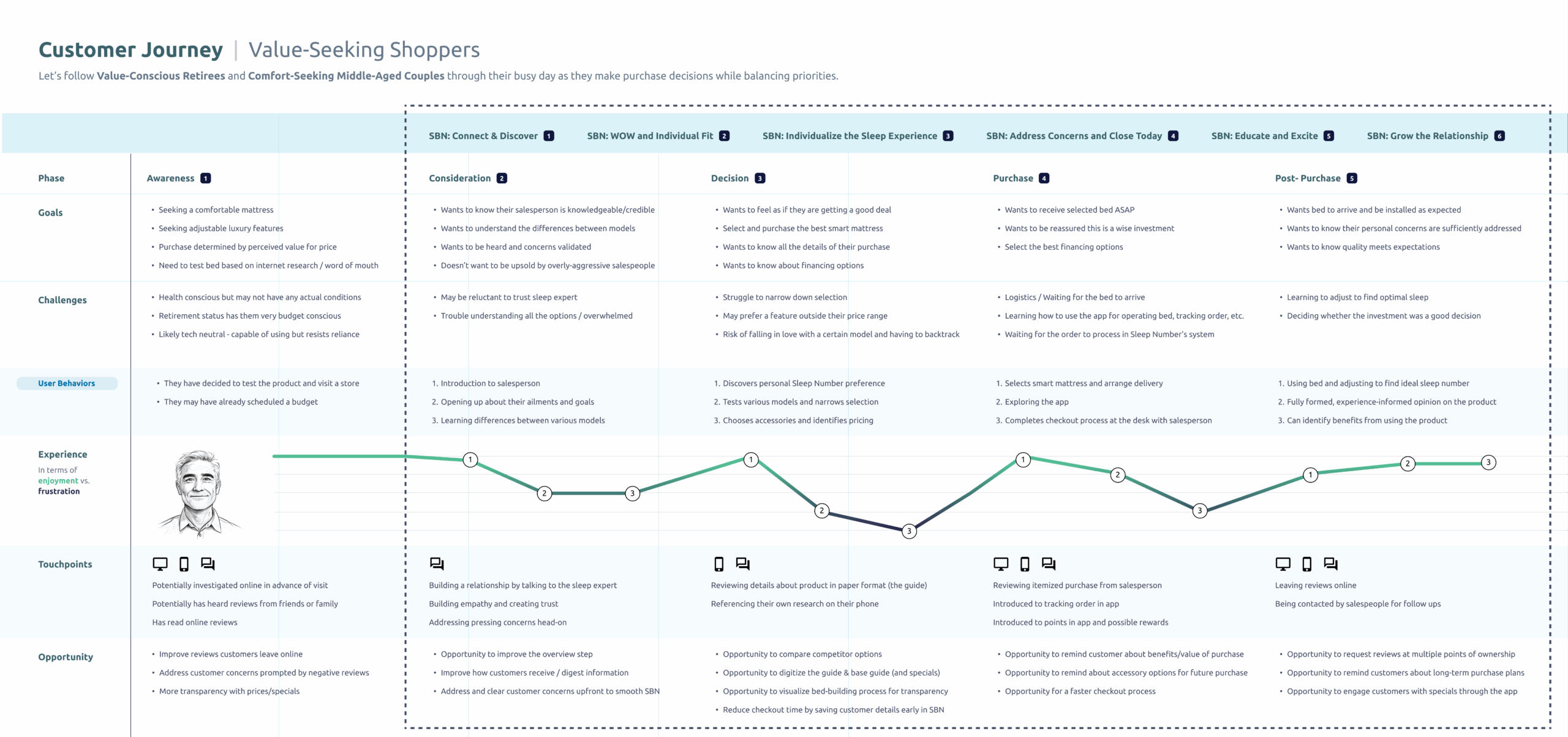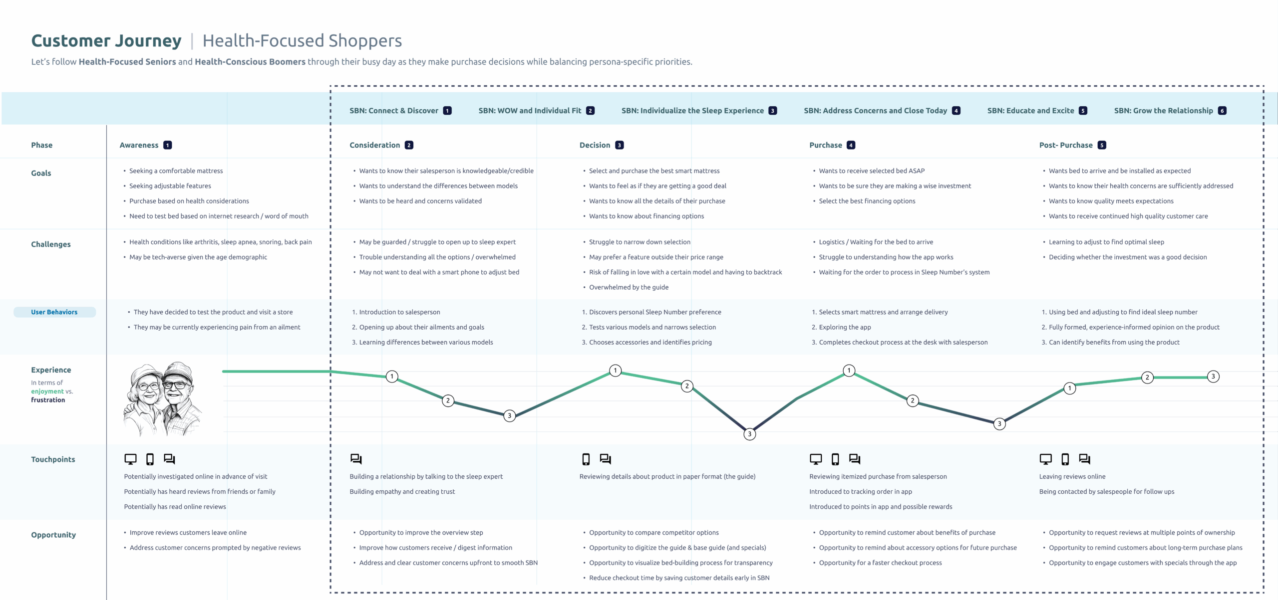 Through interviews with Sleep Number’s “Sleep Experts” and analysis of sales data and customer feedback, we identified patterns in buyer behavior, motivations, and objections. These insights led to the creation of multiple personas, each representing a key customer type—ranging from health-conscious sleepers looking for long-term wellness solutions, to budget-focused shoppers primarily interested in promotions, to couples navigating differing sleep preferences.